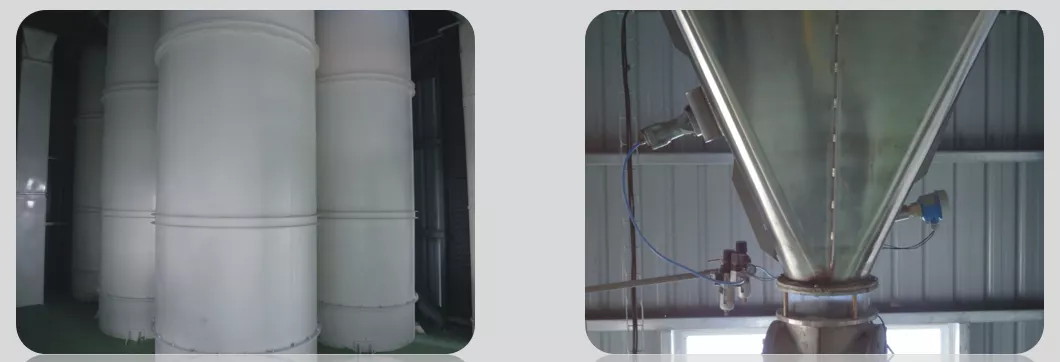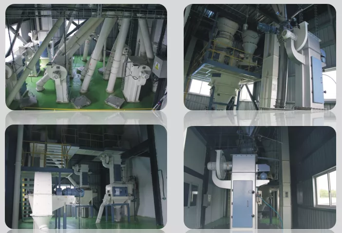 通過(guò)垂直落料工藝設(shè)計(jì),將原料倉(cāng)由傳統(tǒng)的方形倉(cāng)改為圓筒倉(cāng),并配有自清裝置,最大限度的減少了物料的殘留與產(chǎn)品間的交叉污染。