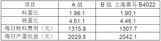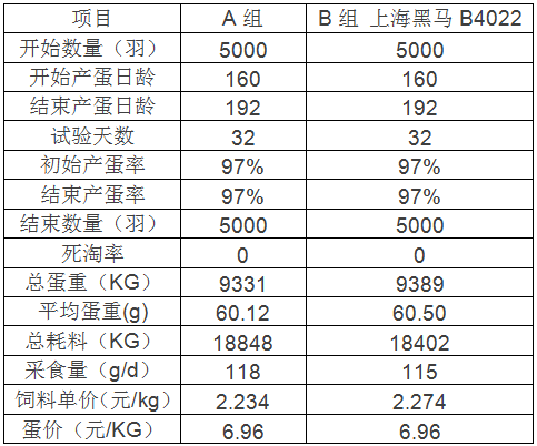 將10000羽雞分為兩組,分別飼喂黑馬B4022和另一知名品牌5%蛋雞料,用料32天后,計(jì)算實(shí)證數(shù)據(jù)核算經(jīng)濟(jì)效益,為后期全群飼喂提供精確依據(jù),飼喂數(shù)據(jù)如下: