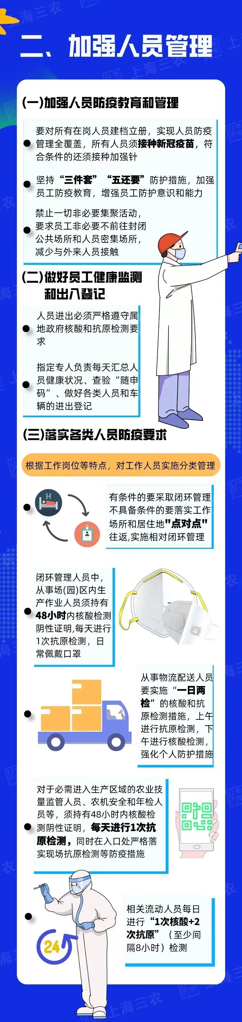 您當前所在位置:首頁 > 新聞中心 > 行業資訊 行業資訊 一圖讀懂 | 上海市農業生產單位復工復產疫情防控要點 在采取嚴格的閉環管理,做好人員消毒、環境和車輛消殺工作,并按時做好必要的核酸檢測和抗原檢測后,是可以保證產品供給安全和穩定的。 分享到:點擊次數: 更新時間:2022-04-26 17:30:18 【打印此頁】 【關閉】 上一條:五一國際勞動節 | 向最美勞動者致敬! 下一條:兩部委:畜禽養殖場所和飼料獸藥生產、屠宰加工企業采取閉環管理,獸藥、動物疫苗等物資經規范消殺后允許流通