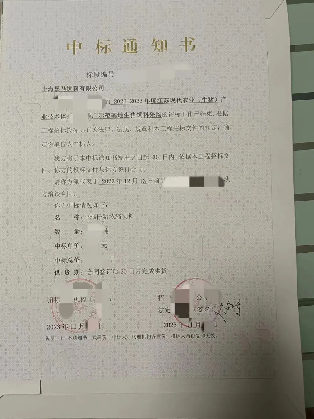 近日,我司參加了江蘇現代農業產業體系推廣示范基地飼料采購項目招投標活動,經過數輪激烈的競爭,我司成功中標該項目。