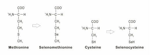 在酵母發(fā)酵過程中加入適量的無機(jī)硒,利用酵母對(duì)硒的富集效應(yīng),就能生產(chǎn)出有機(jī)形式硒。酵母硒中的有機(jī)硒包括硒代蛋氨酸、硒代胱氨酸、CH3SeH(甲基硒酸)、含硒蛋白質(zhì)及其它硒化物。其中,硒代蛋氨酸占比最高,其次是硒代胱氨酸。這兩種硒化氨基酸的結(jié)構(gòu)與常規(guī)氨基酸蛋氨酸(Met)和半胱氨酸(Cys)相同,只是硒取代了硫原子。