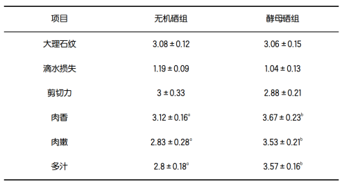 下表中,酵母硒組較無機(jī)硒組有降低滴水損失的趨勢(shì),酵母硒組肉香、肉嫩和多汁評(píng)分較無機(jī)硒組顯著提高,表明酵母硒可降低滴水損失,且能提高肉香、嫩度及多汁。